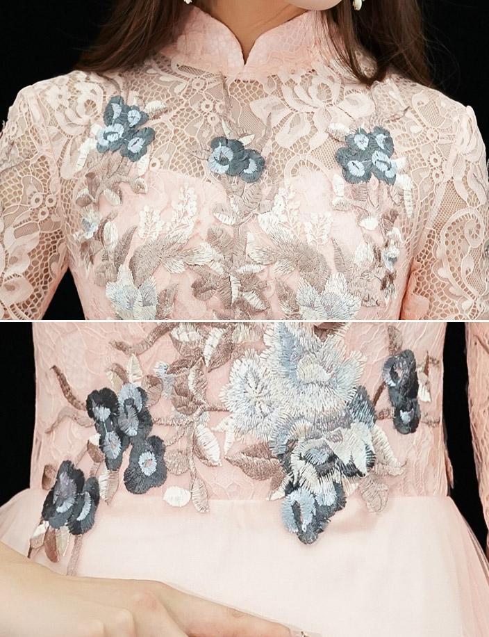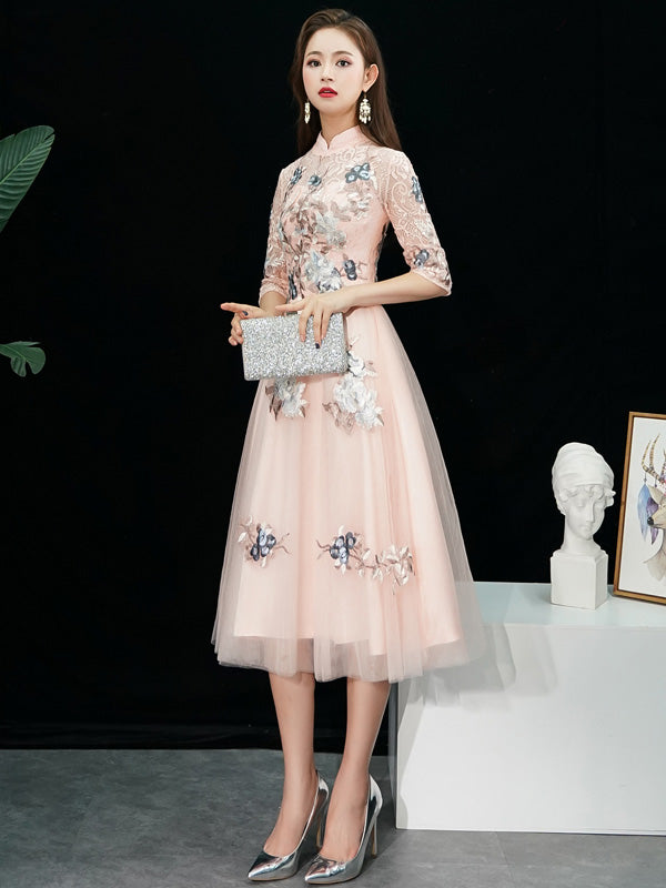 Bridesmaid Pink Floral Midi Tulle Qipao Cheongsam Dress