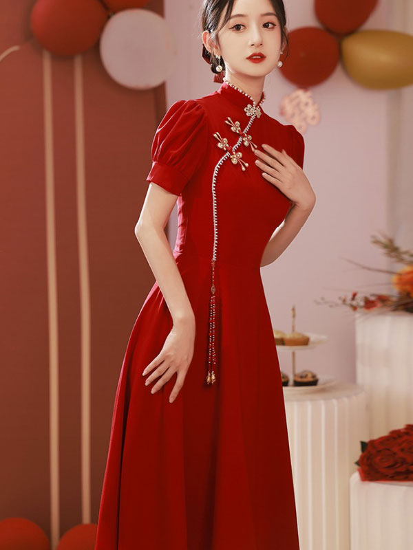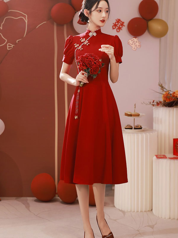 Burgundy A-Line Puff Sleeve Wedding Cheongsam Qi Pao Dress