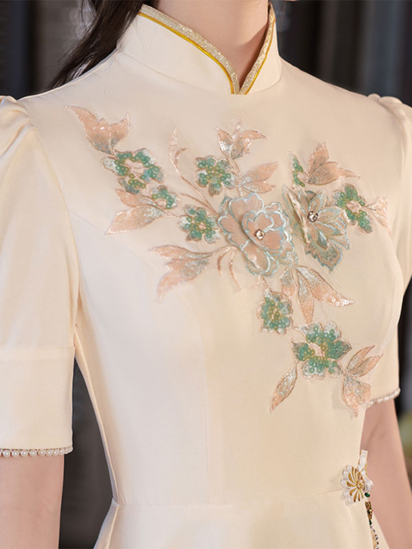 Jacquard Floral Beads Cheongsam Qipao Dress