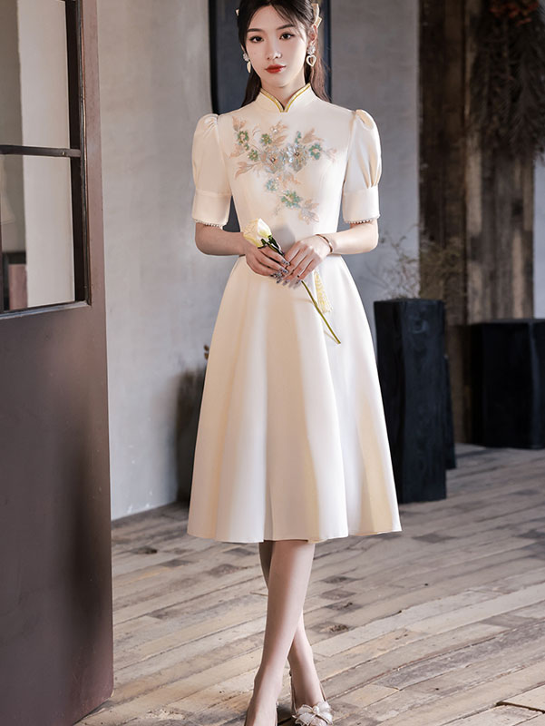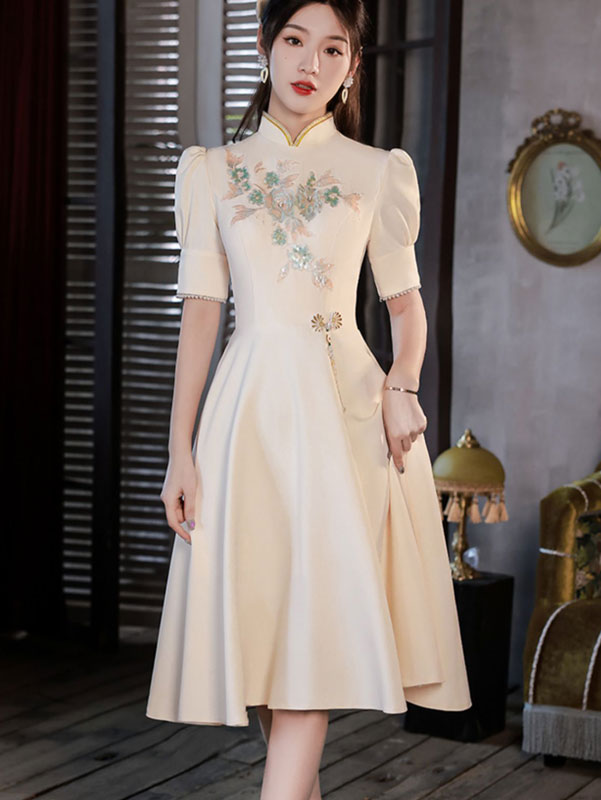 Champagne Midi A-Line Appliques Cheongsam Prom Dress