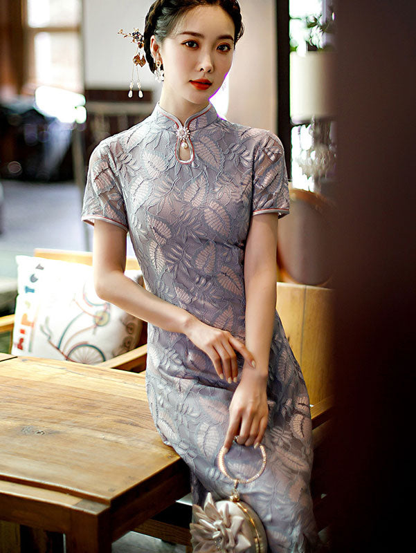 Gray Floral Lace A-Line Cheongsam Qi Pao Dress