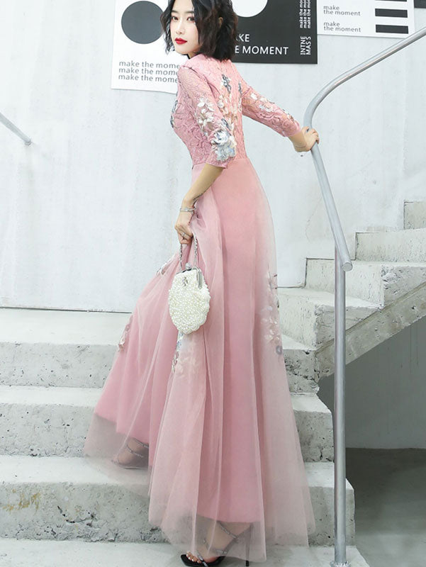 Pink Champagne Appliques Tulle Full Qipao Cheongsam Dress