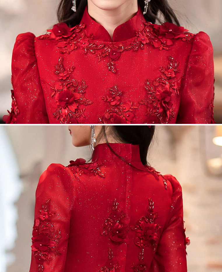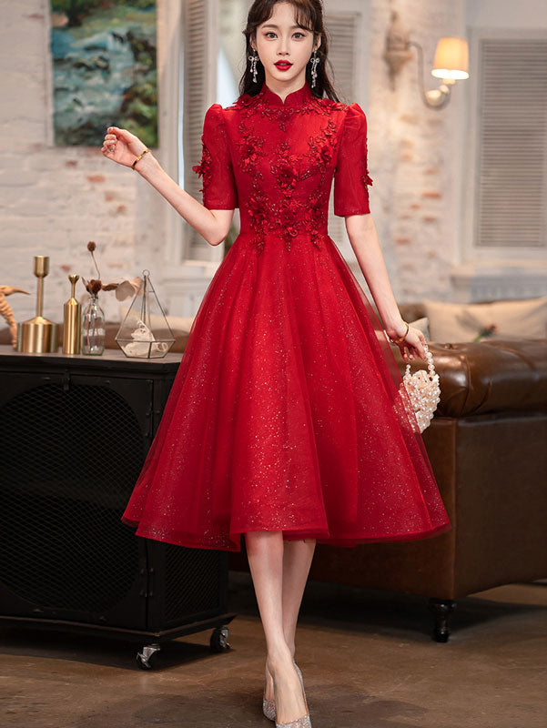 Red Appliques A-Line Tulle Cheongsam Qi Pao Dress