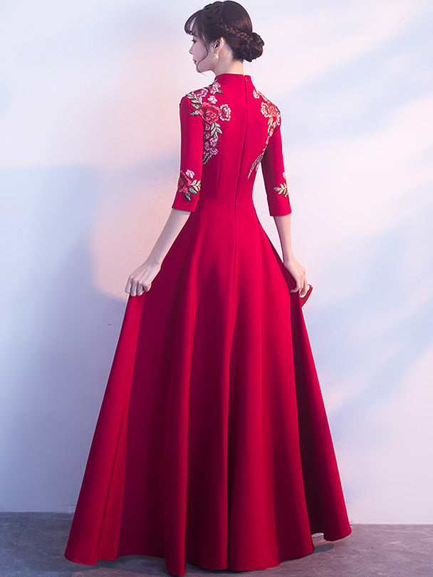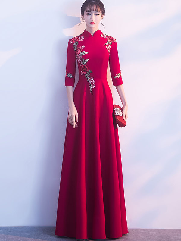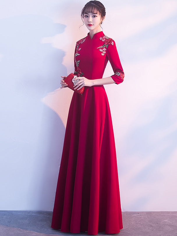 Wine Red Floor-Length Embroidered Qipao / Cheongsam Dress
