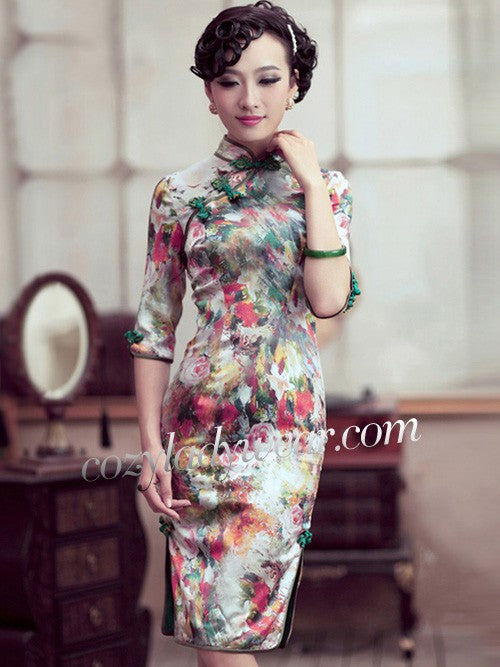 Clearance Floral Mulberry Silk Half Sleeve Qipao Cheongsam Dress