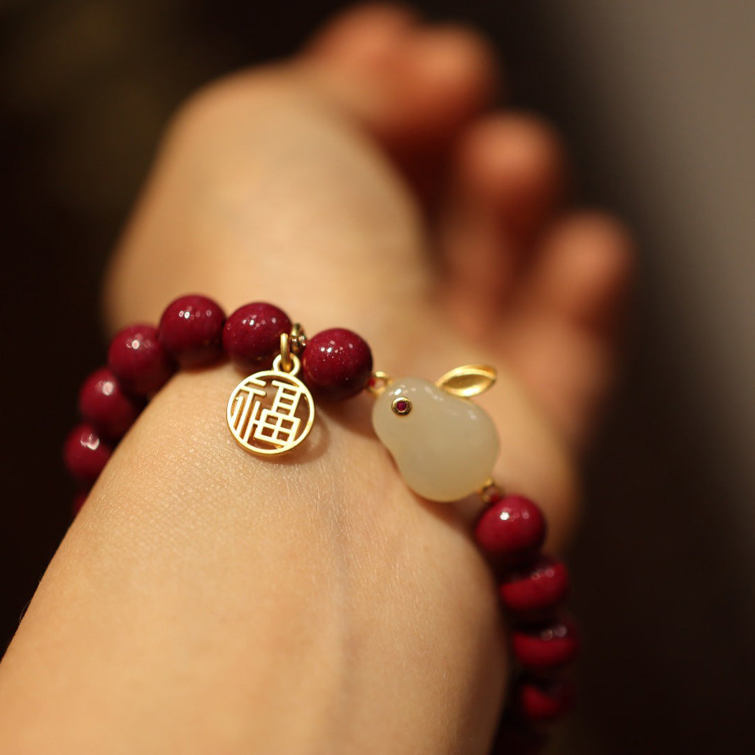 The bracelets are made of 8mm cinnabar beads and zodiac rabbit pendant.