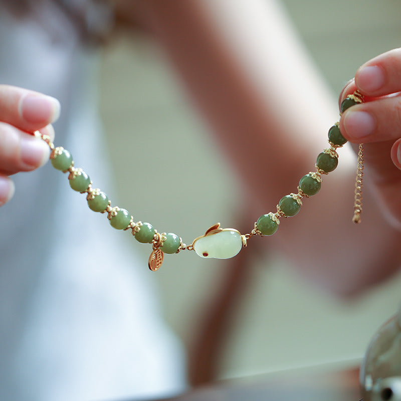 The bracelet is made of 8mm jade beads and zodiac rabbit sign.