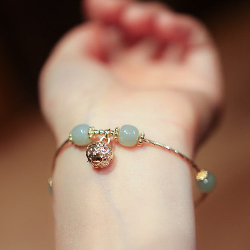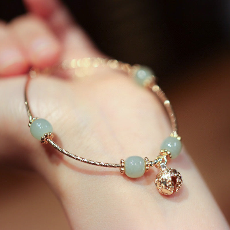 The bracelet is made of 7*8mm jade, 5mm pearls and bell pendant.