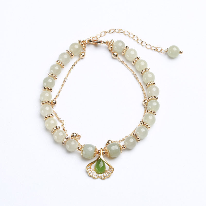The bracelet is made of 6mm jade beads, ginkgo leaf and plum blossom pendant.
