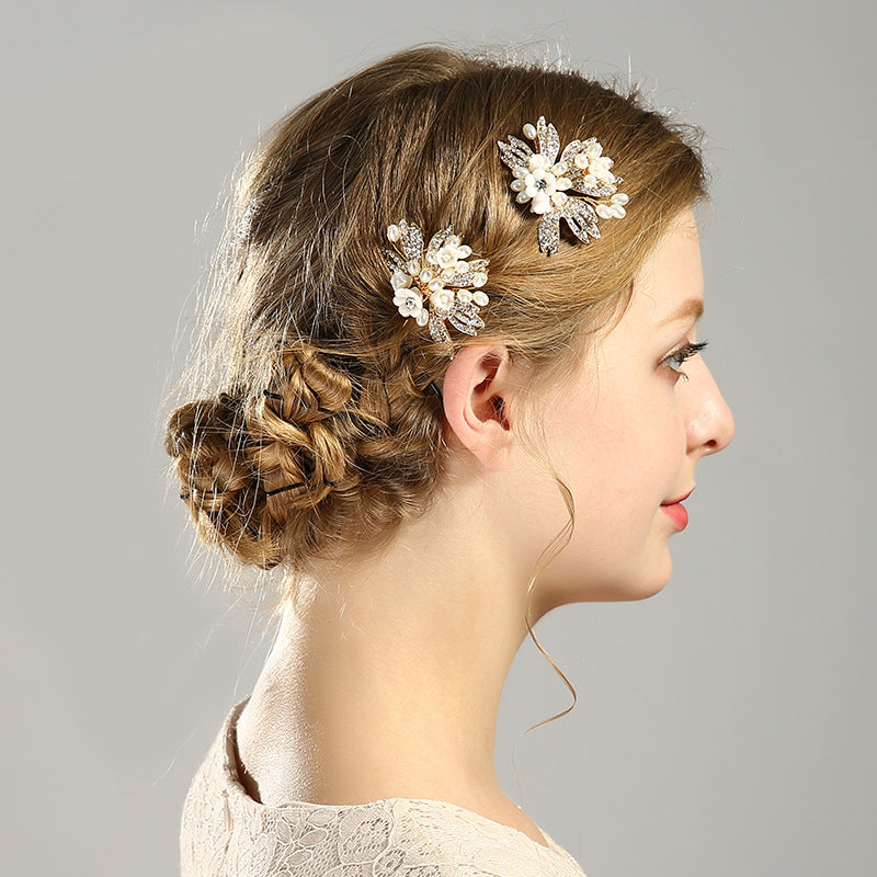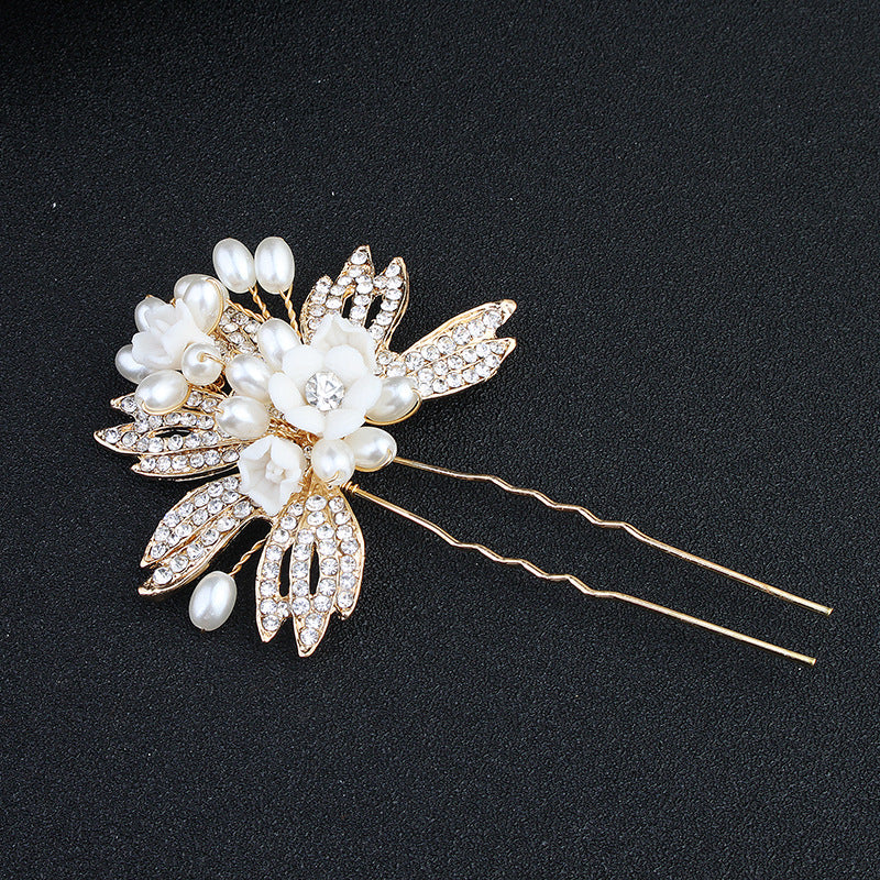 This set of 2 wedding hair pieces are made of rhinestones, white ceramic flower and light rose gold plated leaves