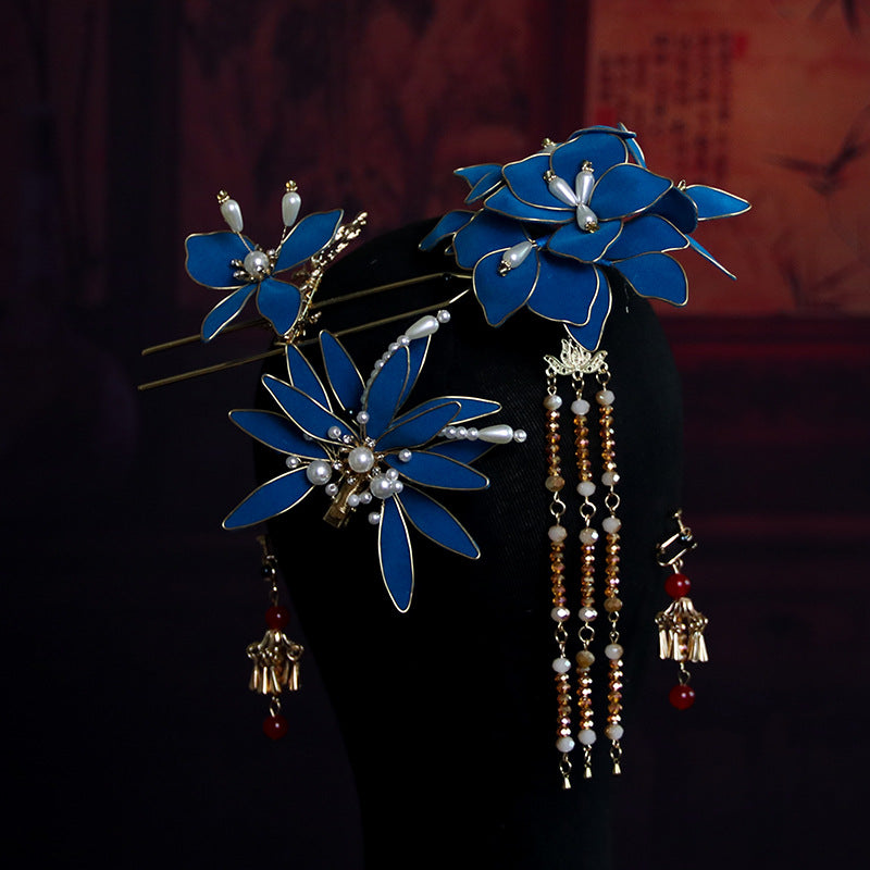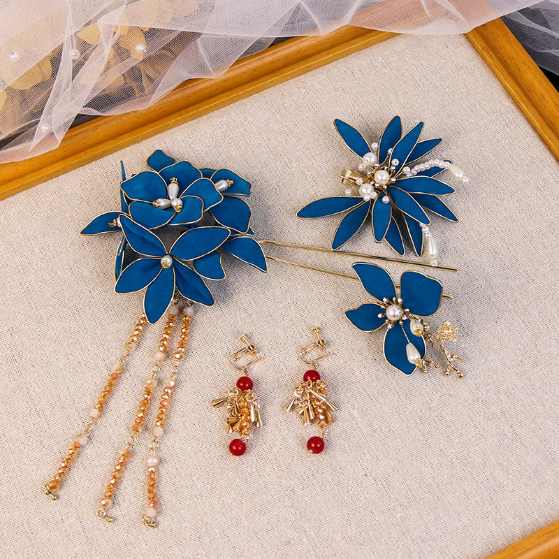 3 Pcs Blue Wedding Flower Hair Clips Pins & Earrings