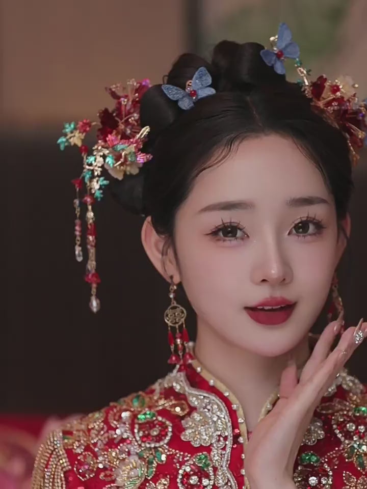 Featuring red flowers and blue butterfly, the hair clips are perfect for enhancing your bridal traditional dress.