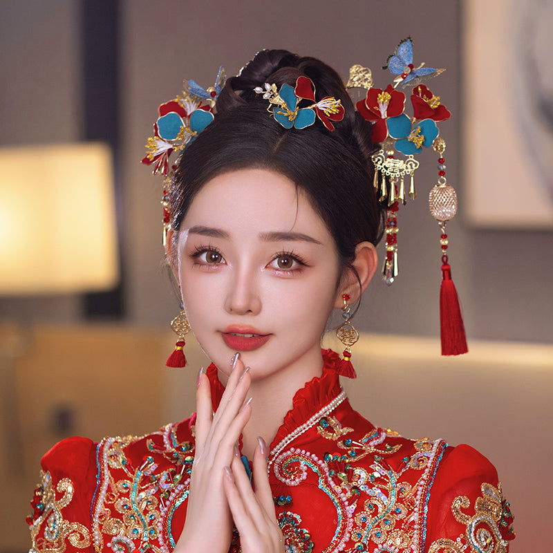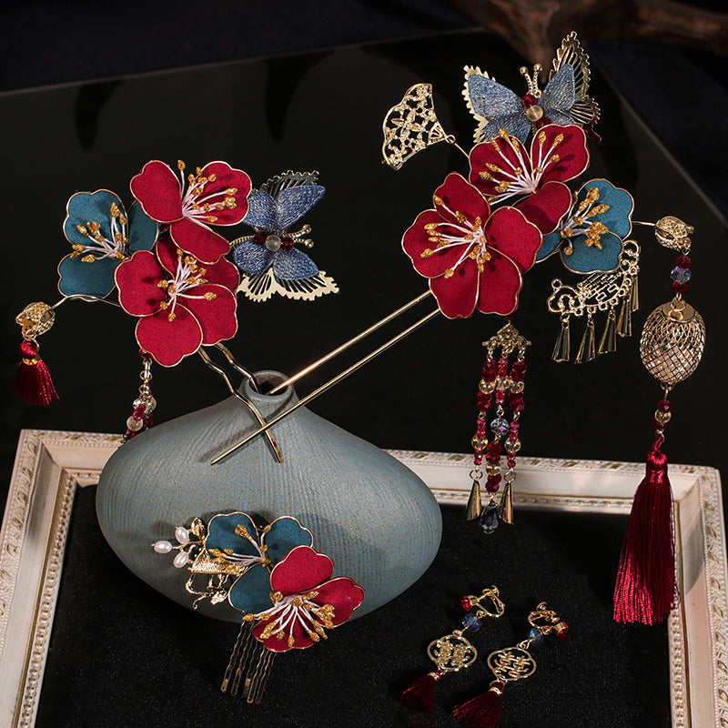 The hair clips feature butterfly, red and blue flowers with shiny alloy centers, creating a sophisticated and delicate appearance.