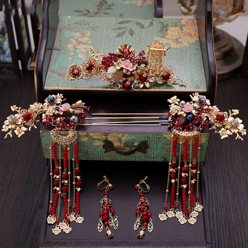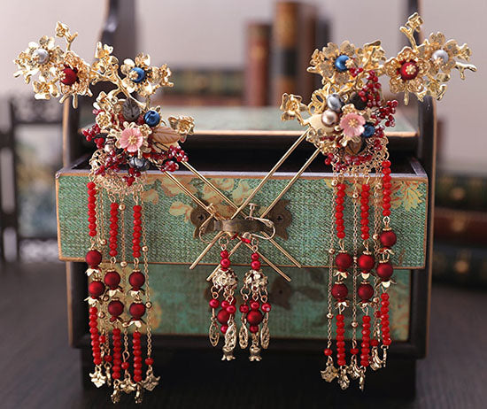 This traditional Chinese wedding hair clips combines beautiful red beads