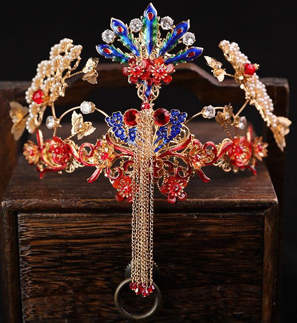 This traditional gold tone Chinese wedding hair clips combines beautiful red beads