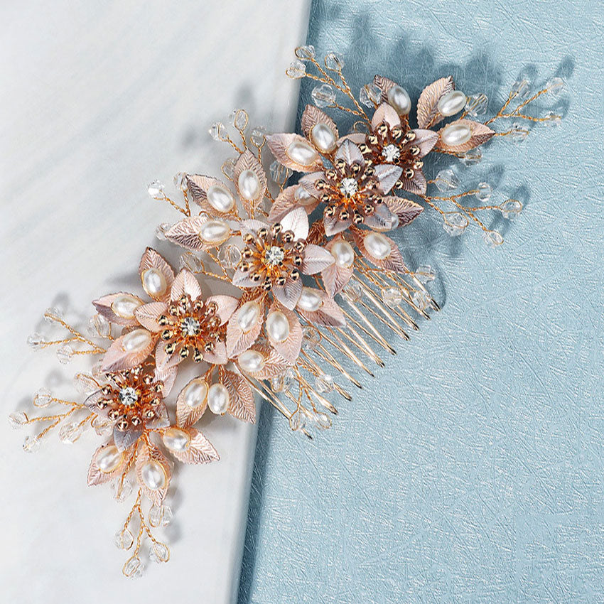 This hair headpiece is made of pearls, crystal beads and alloy wire.