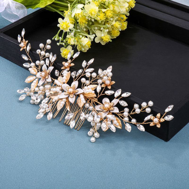 Gold tone leaves hair comb in unique design and excellent workmanship, made of pearls, crystals, and alloy.