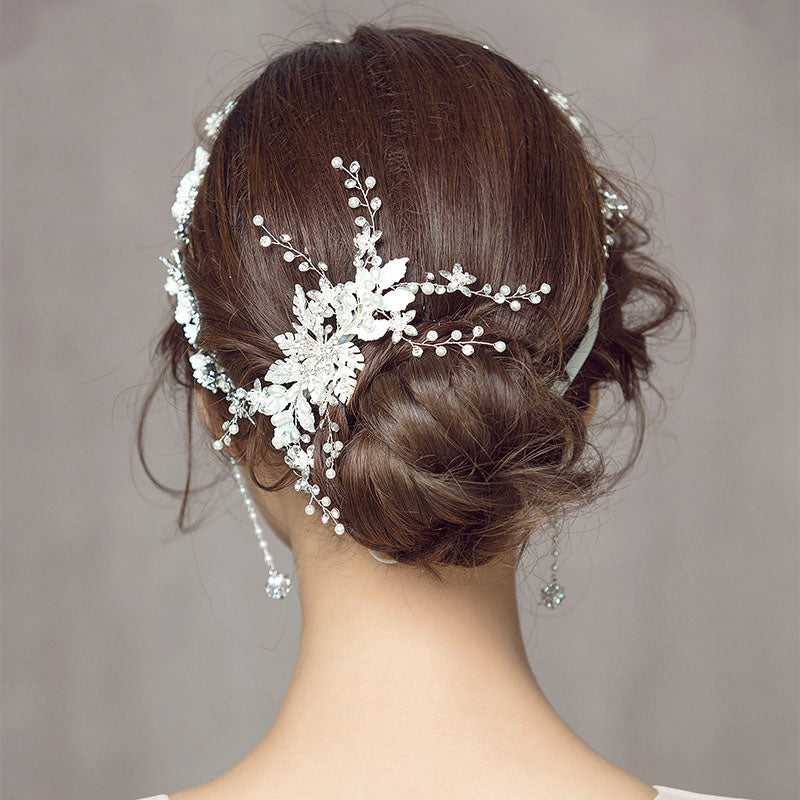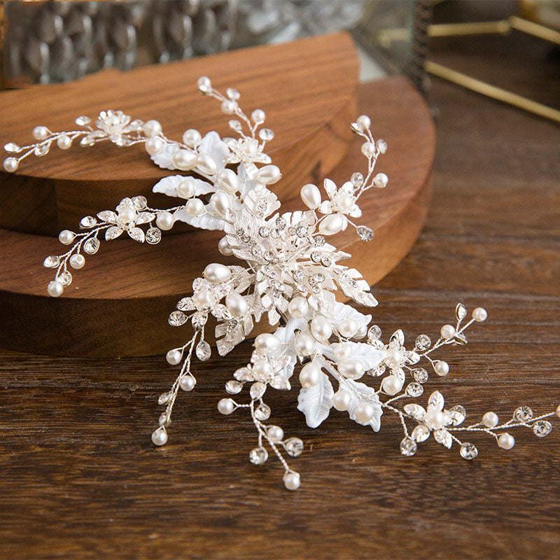 The pearls, crystal and brushed leaves offer beautiful sparkle and a unique touch to your bridal hairstyle.