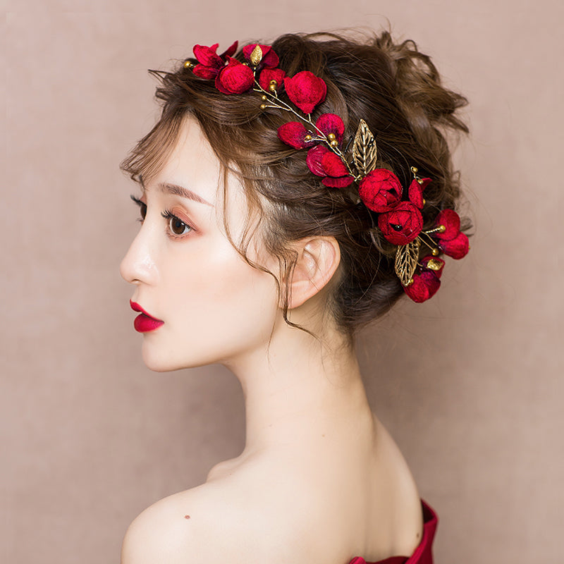 A light-catching vine of red red blossoms and gold tone sprigs and leaves makes for the most alluring of bohemian hair adornments.