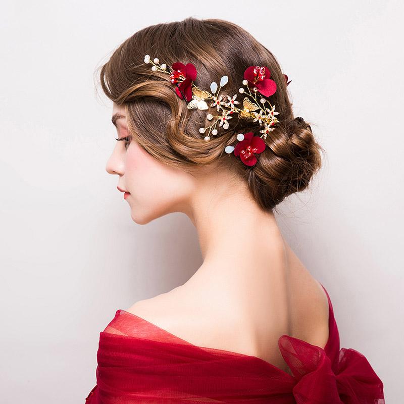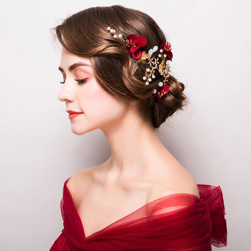 Red fabric add a whimsical flourish to gleaming pearly blossoms and sparkling crystal sprigs on this ethereal hair vine.