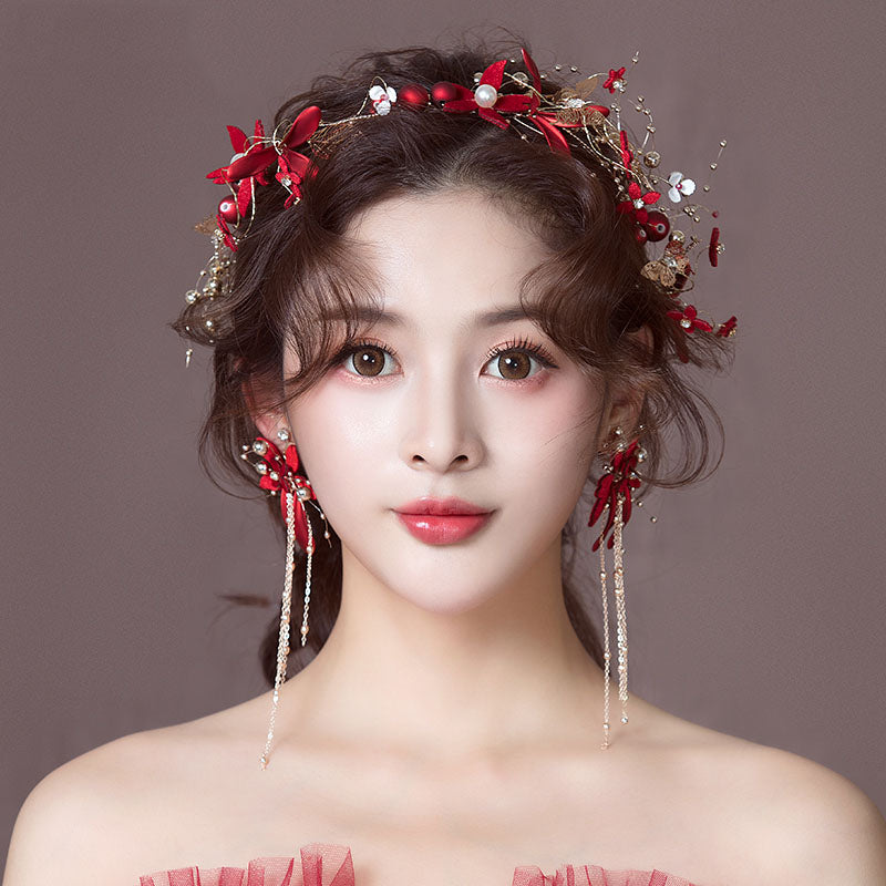 A light-catching vine of red silk blossoms and pearl, delicate sprigs and leaves