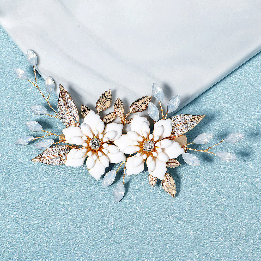 This delicate wedding hair accessory is made of white flowers, gold alloy leaves with rhinestone.