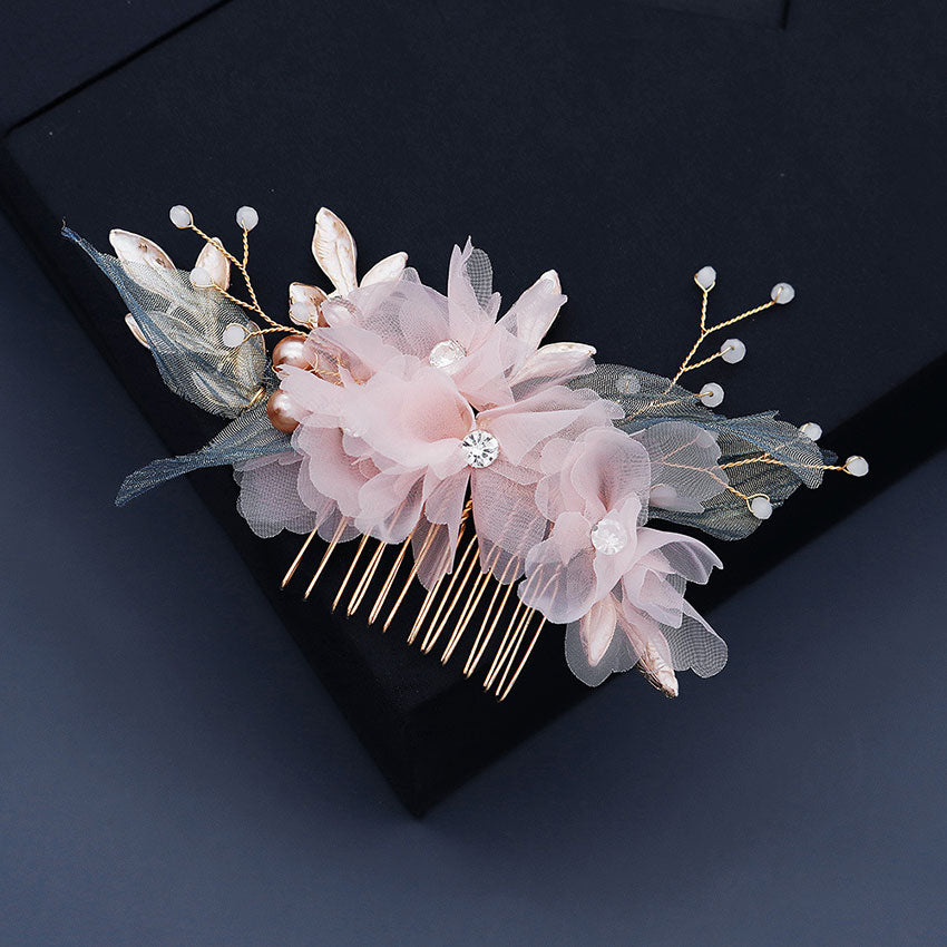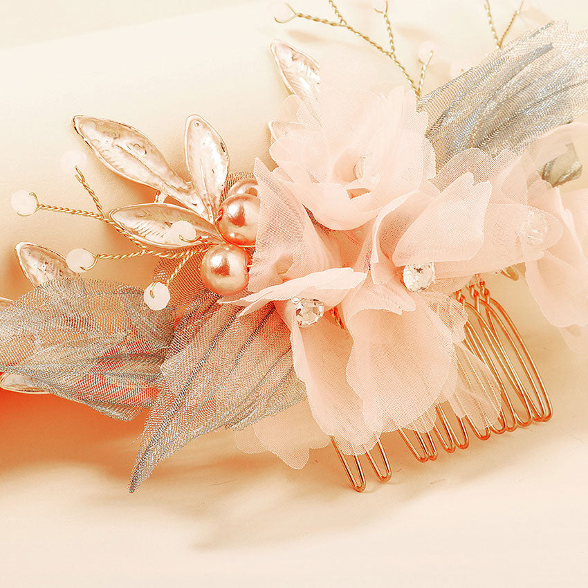 This hair headpiece is made of copper flower pearls, rhinestone and alloy.