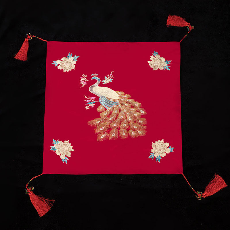 It has traditional floral & peacock embroidery and knot tassels on each of the four corners.