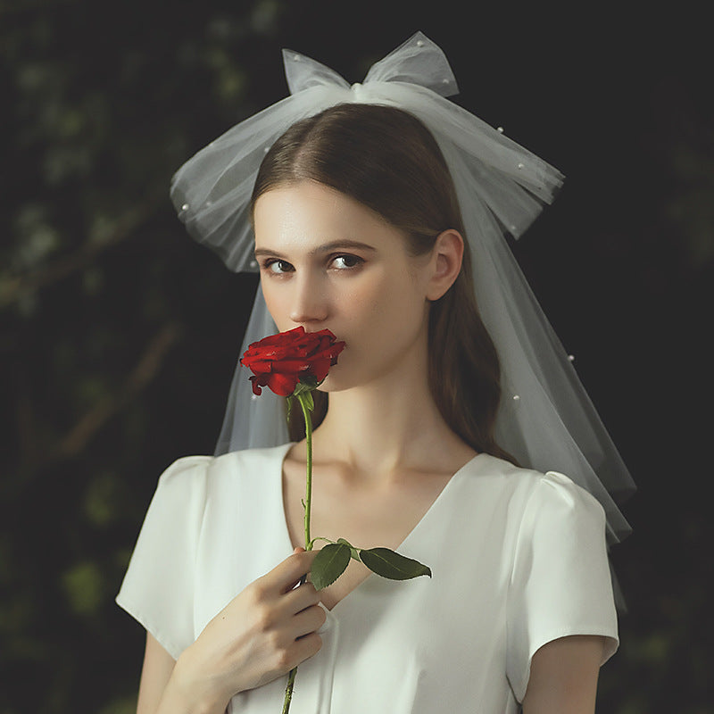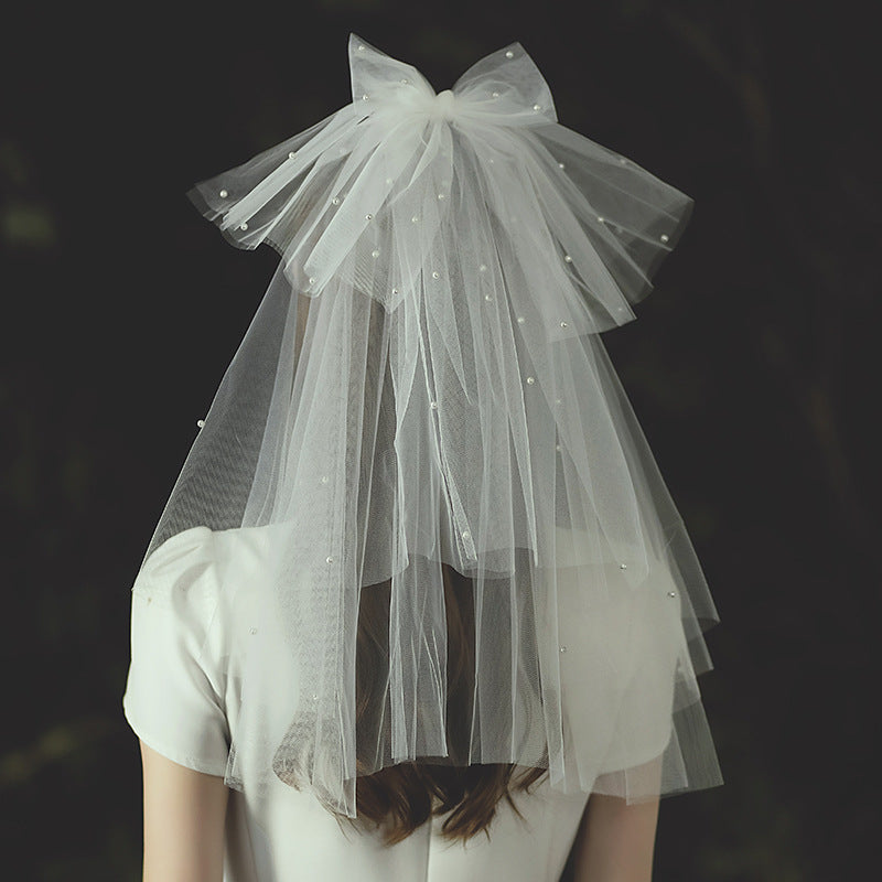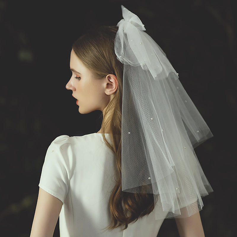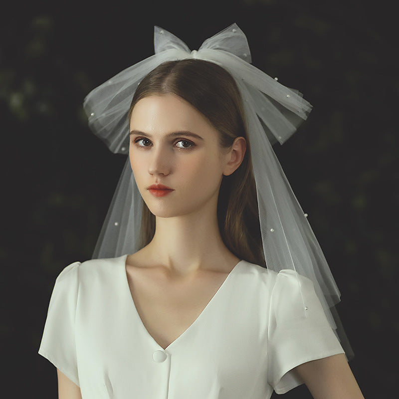 Bridal hair veil made from exquisite white tulle,finely scattered in delicate pearls. The The bow knot is attached to a small clip for easy positioning in hair.