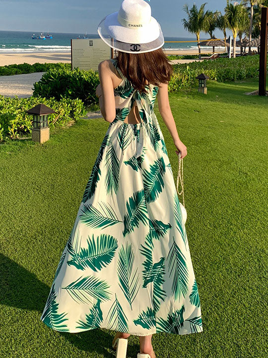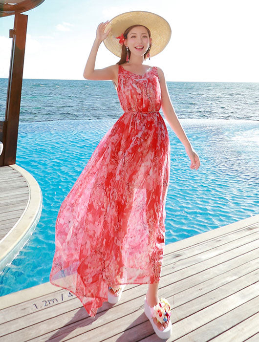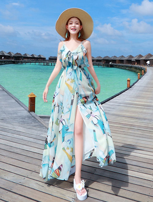 Blue Floral Frill Maxi Beach Dress with Thigh Split