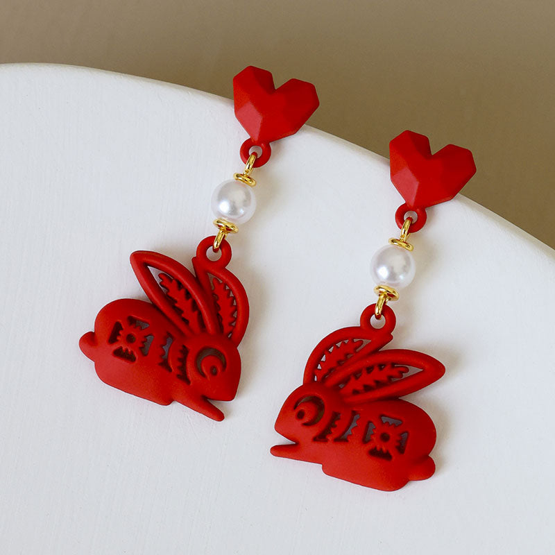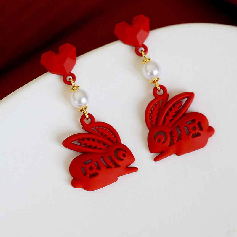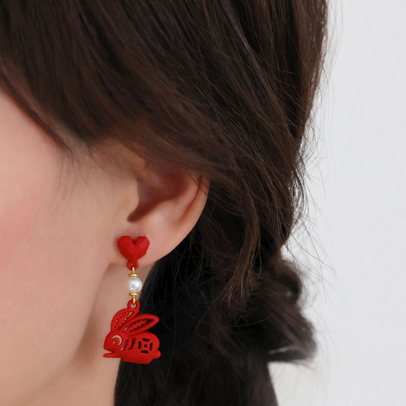 Classical Chinese style red stud earrings with paper cutting Zodiac rabbit shape.