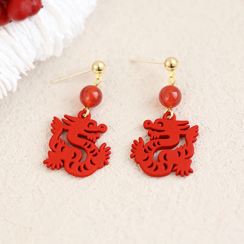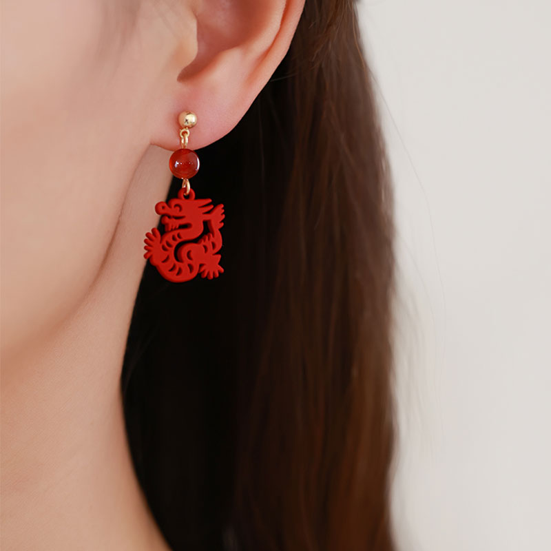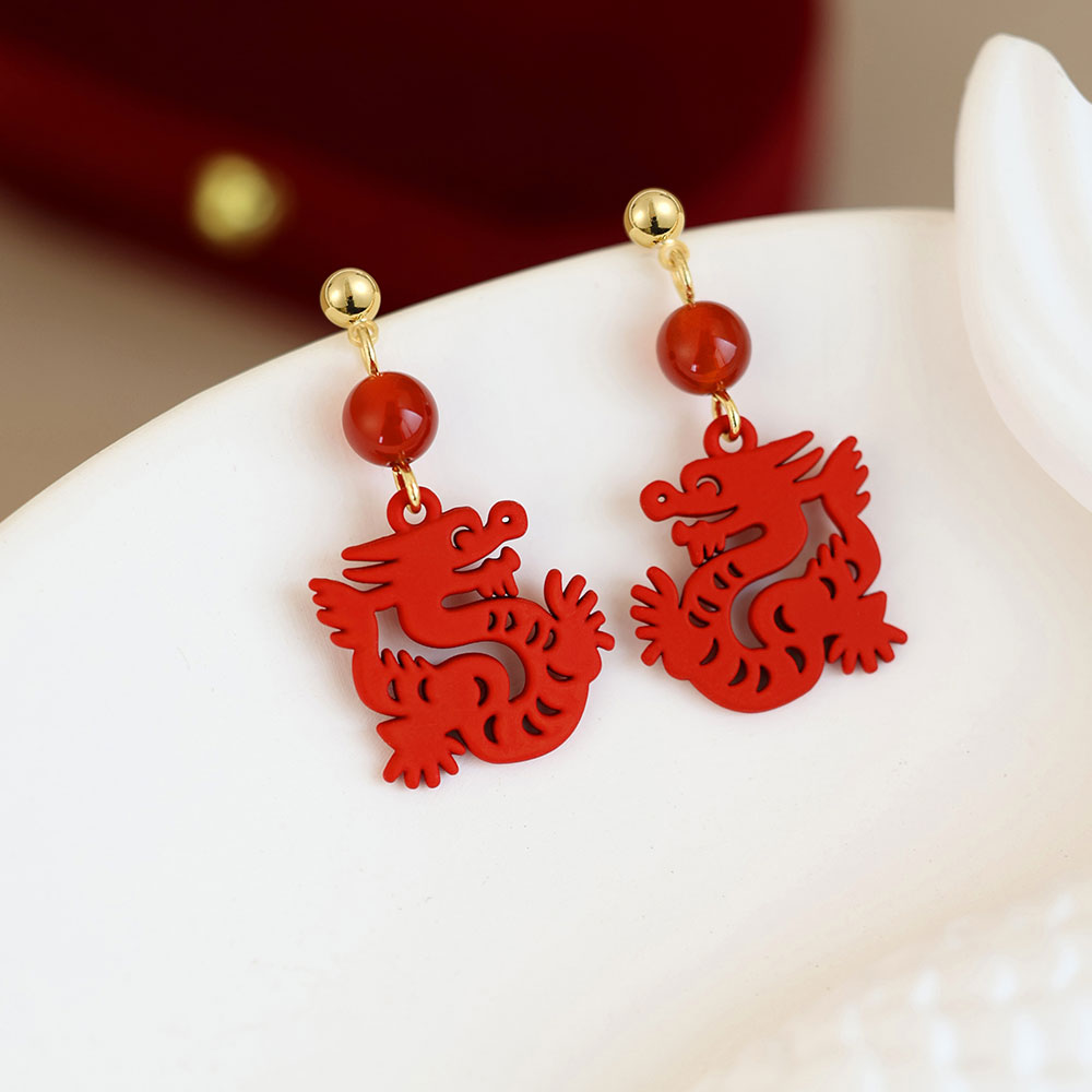 Classical Chinese style red stud earrings with paper cutting Zodiac dragon shape.