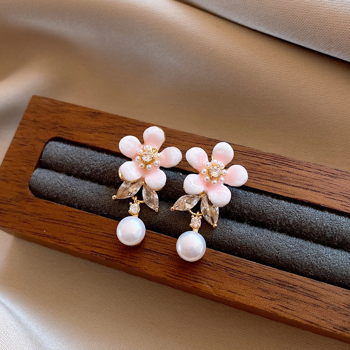 The earrings feature a delicate flower shape with pink petals around the center, set with zircon and pearls.