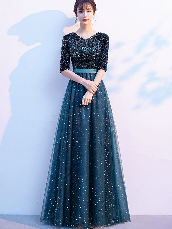 Shimmer Fit & Flare Tulle V-neck Prom Dress