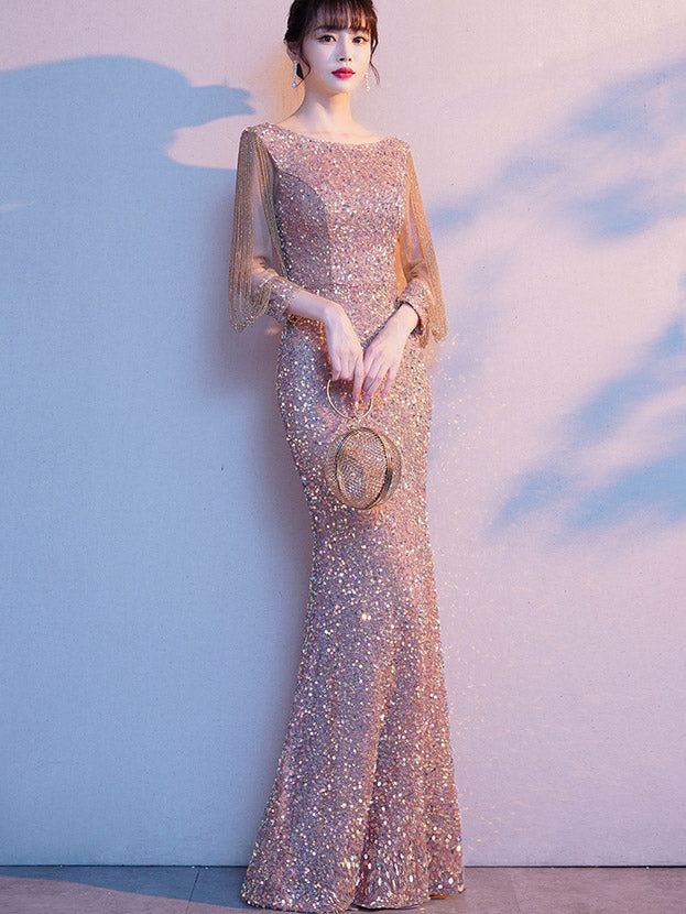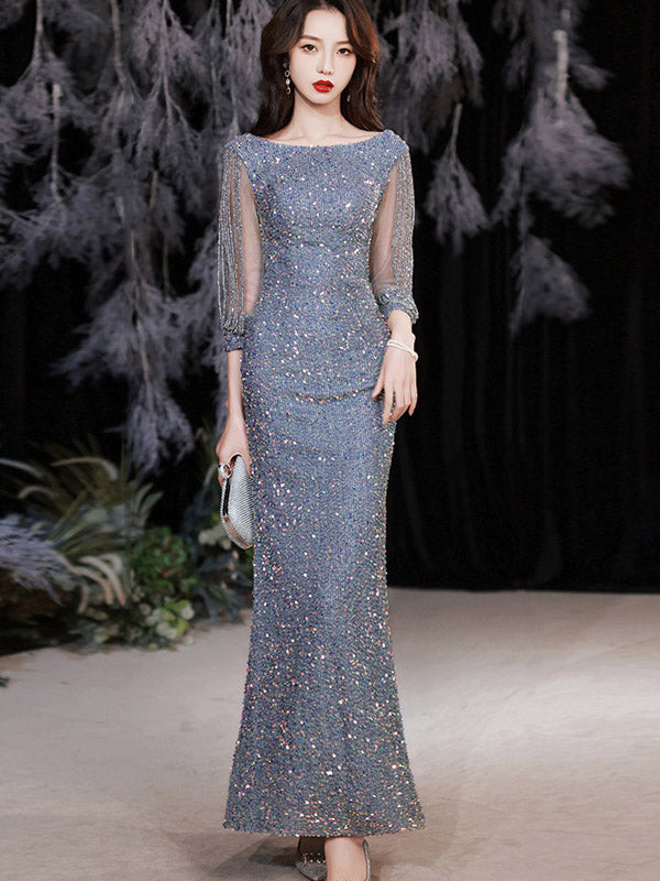 Sequins Boat Neck Beads Sleeve Mermaid Fishtail Dress