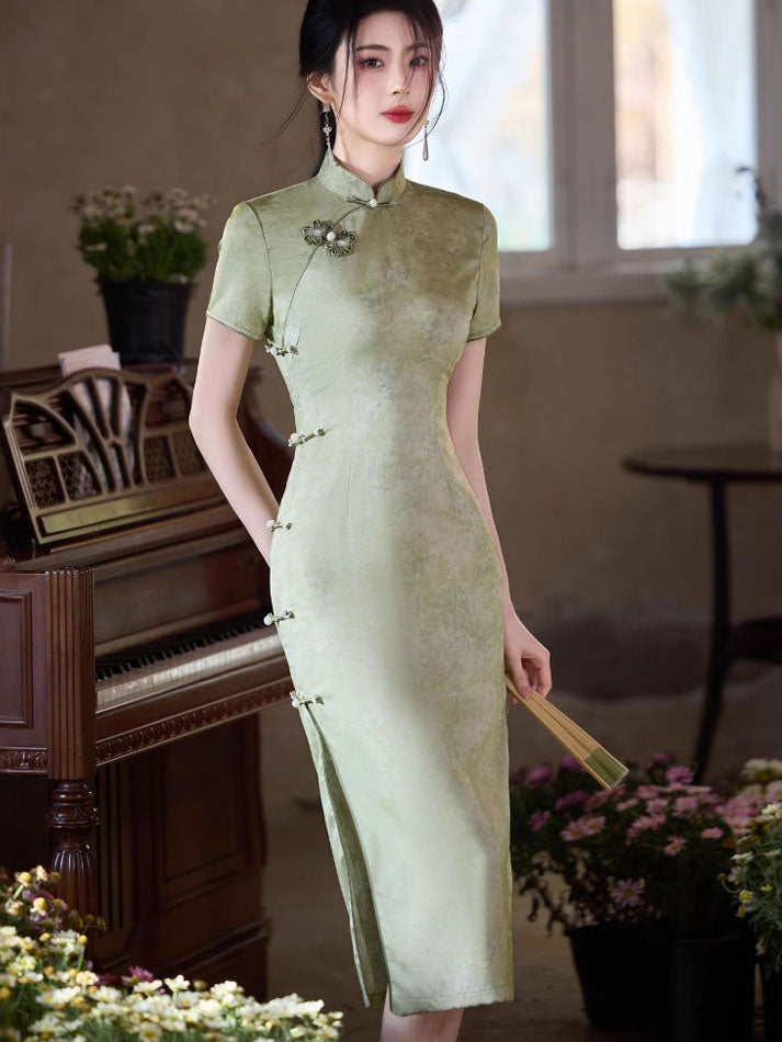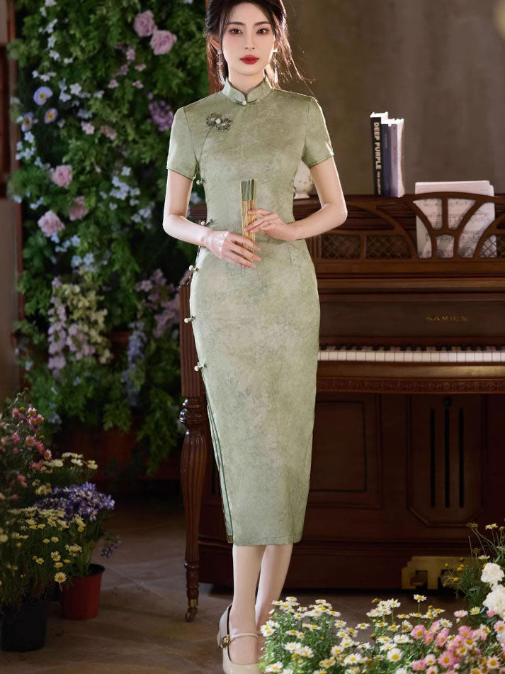 Green Gray Mothers Jacquard A-Line Cheongsam Qipao Dress