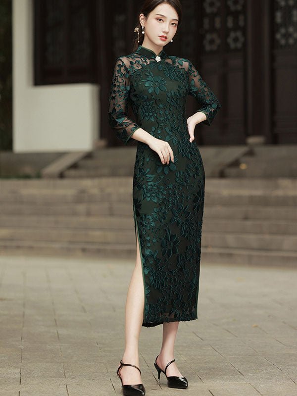 Black Green Velvet Long Qipao / Cheongsam Dress with Lace Sleeves