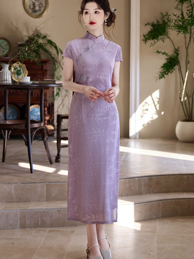 2024 Purple Jacquard Floral Cheongsam Qipao Dress