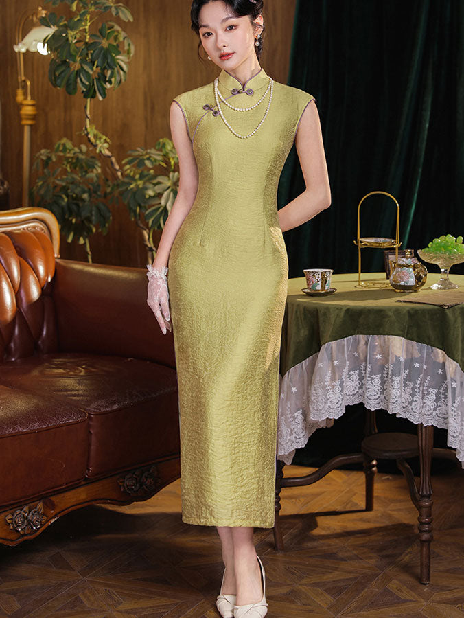 2025 Green Jacquard Midi Cheongsam Qipao Dress