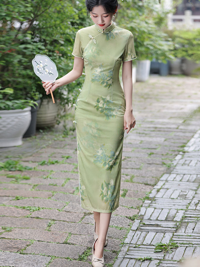 Green Floral Print Summer Cheongsam Qipao Dress
