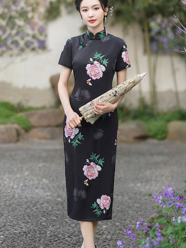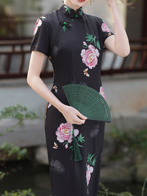 Black Rose Print Tea Qipao Cheongsam Dress
