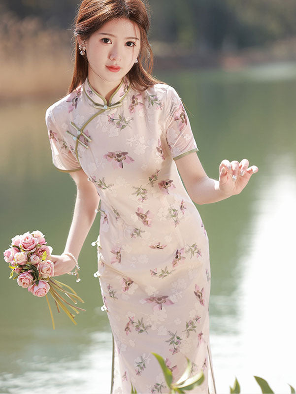 Pink Floral Chiffon Flutter Sleeve Qipao Cheongsam Dress