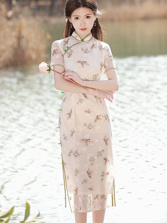 2023 Floral Print Chiffon Midi Qipao Cheongsam Dress