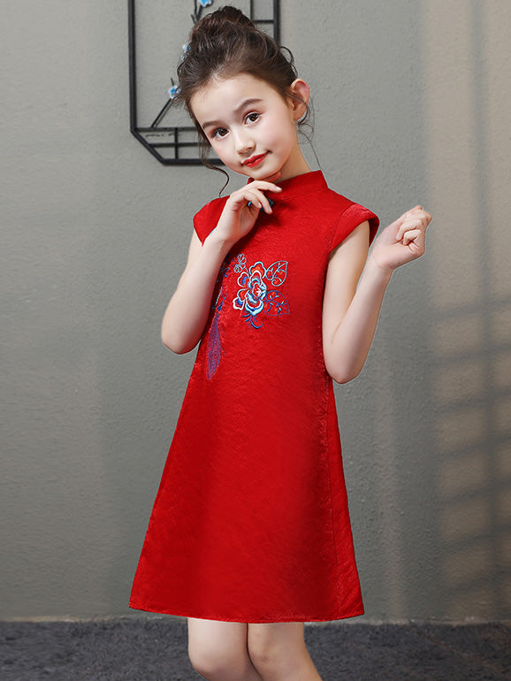 Red Embroidered Kids Girl Cheongsam / Qipao Dress