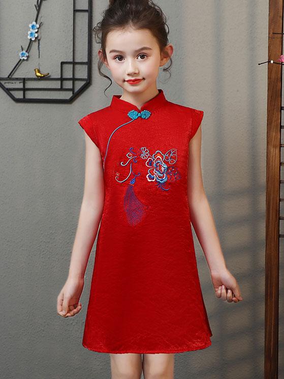 Red Embroidered Kids Girl Cheongsam Qipao Dress
