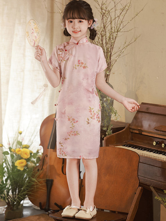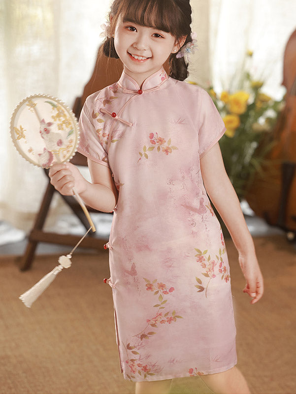 Pink Floral Print Kids Girls Qipao Cheongsam Dress