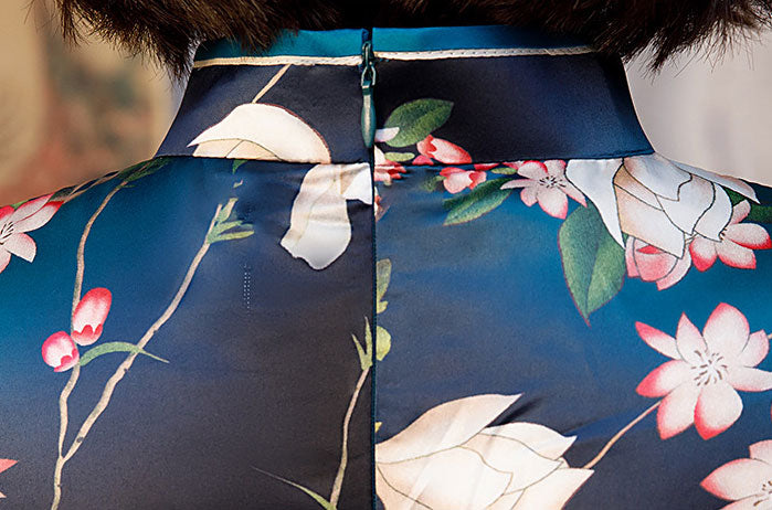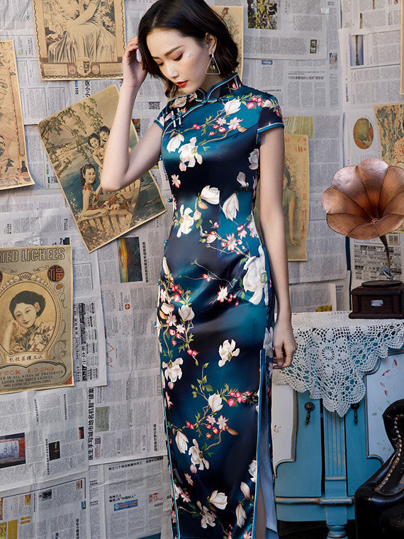 Blue Floral Long Qi Pao Cheongsam Party Dress