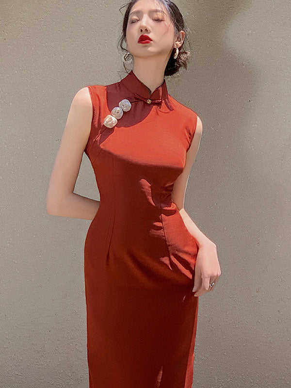 Orange Sleeveless Long Qipao Cheongsam Dress