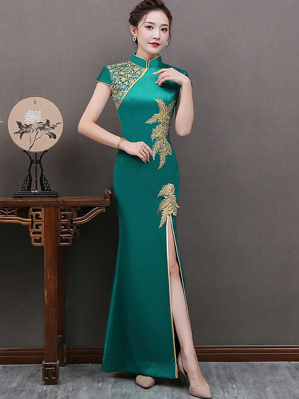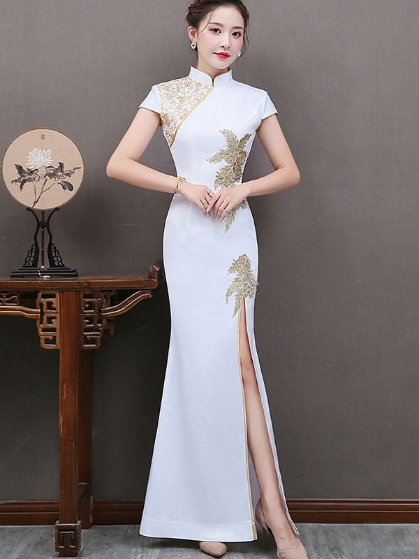 White Green Thigh Split Qipao Cheongsam Evening Dress