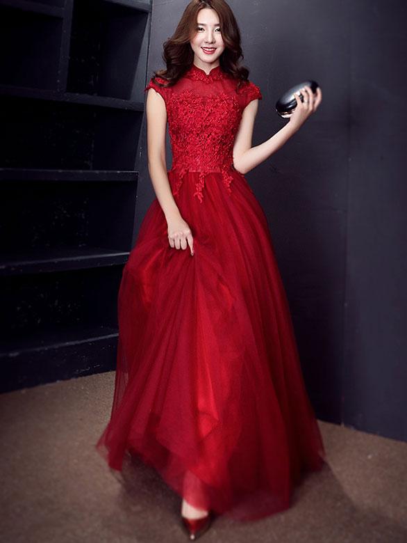 Wine Red Floor-Length Tulle Qipao / Cheongsam Evening Dress